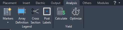 Opens the dialog yield assessment for the current layout, which contains the parameters and device values for the calculation of total yield over a year. This function allows us to compare different layouts and find the yield-oriented optimum.